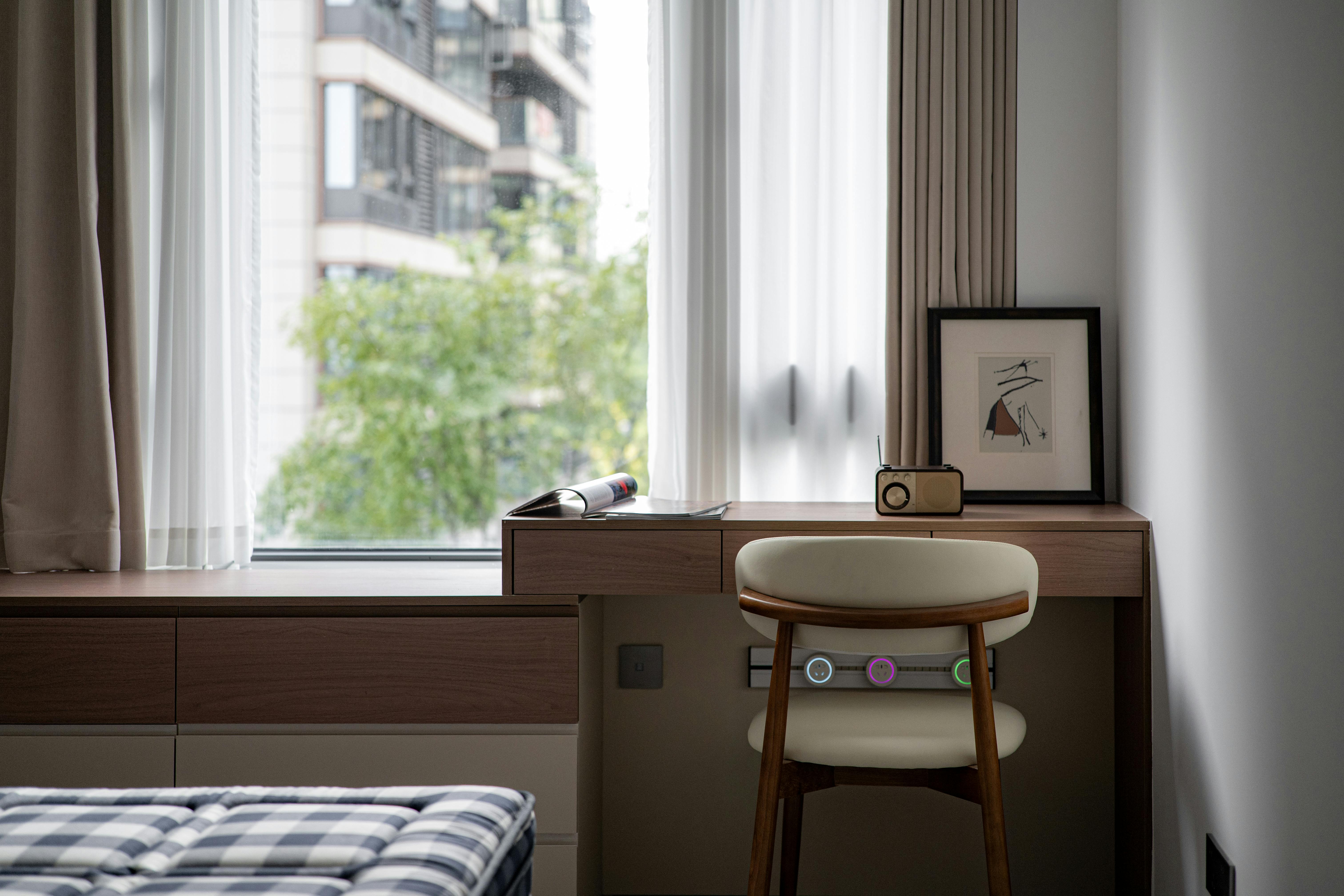 - Camera da letto: biancheria neutra e ordinata, due abat-jour accese per una luce calda e invitante.
